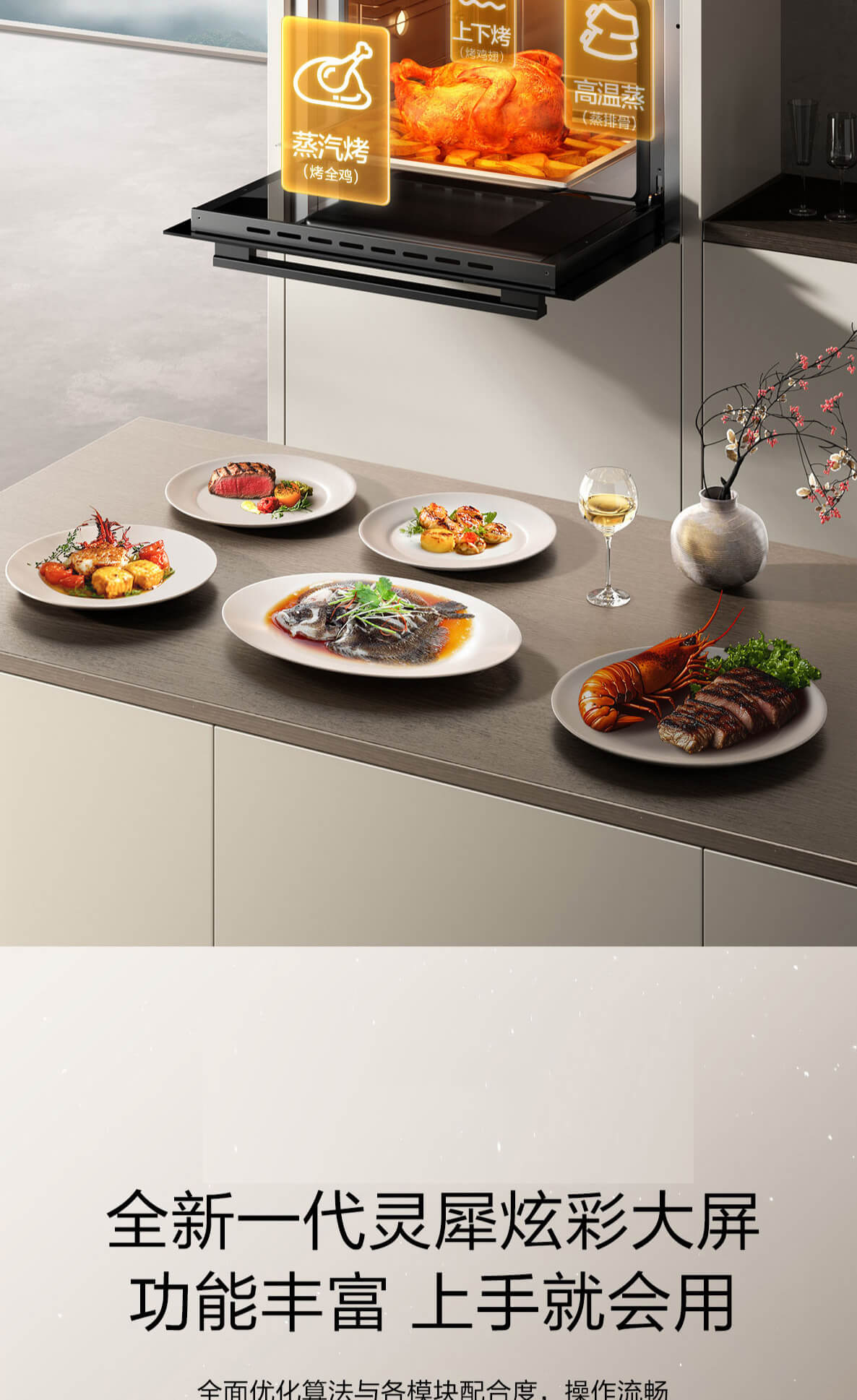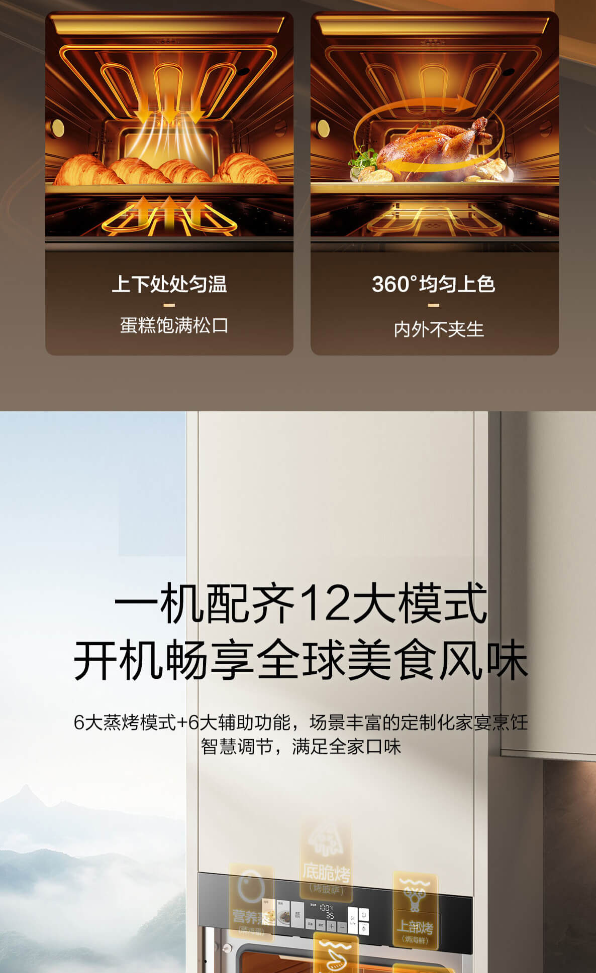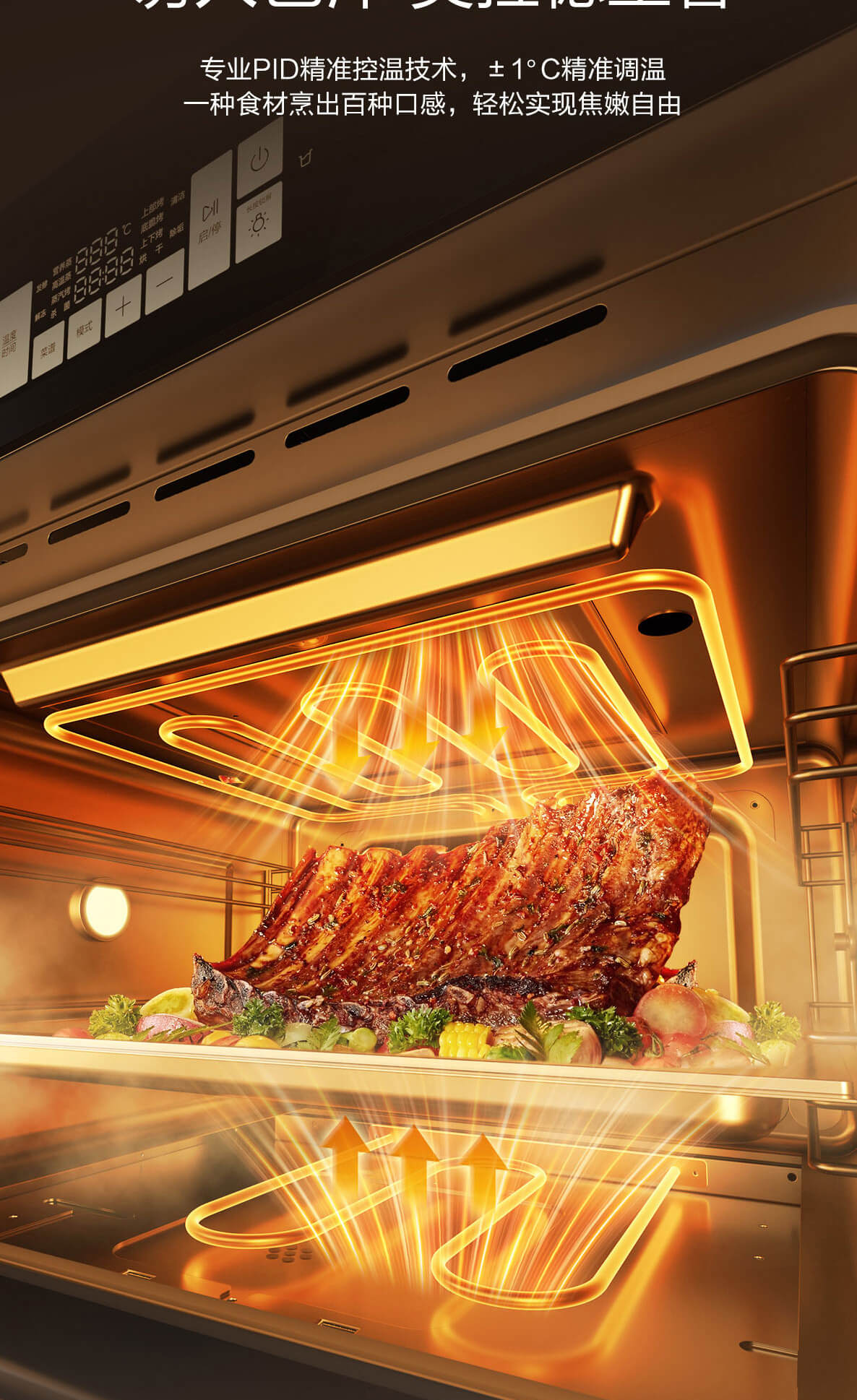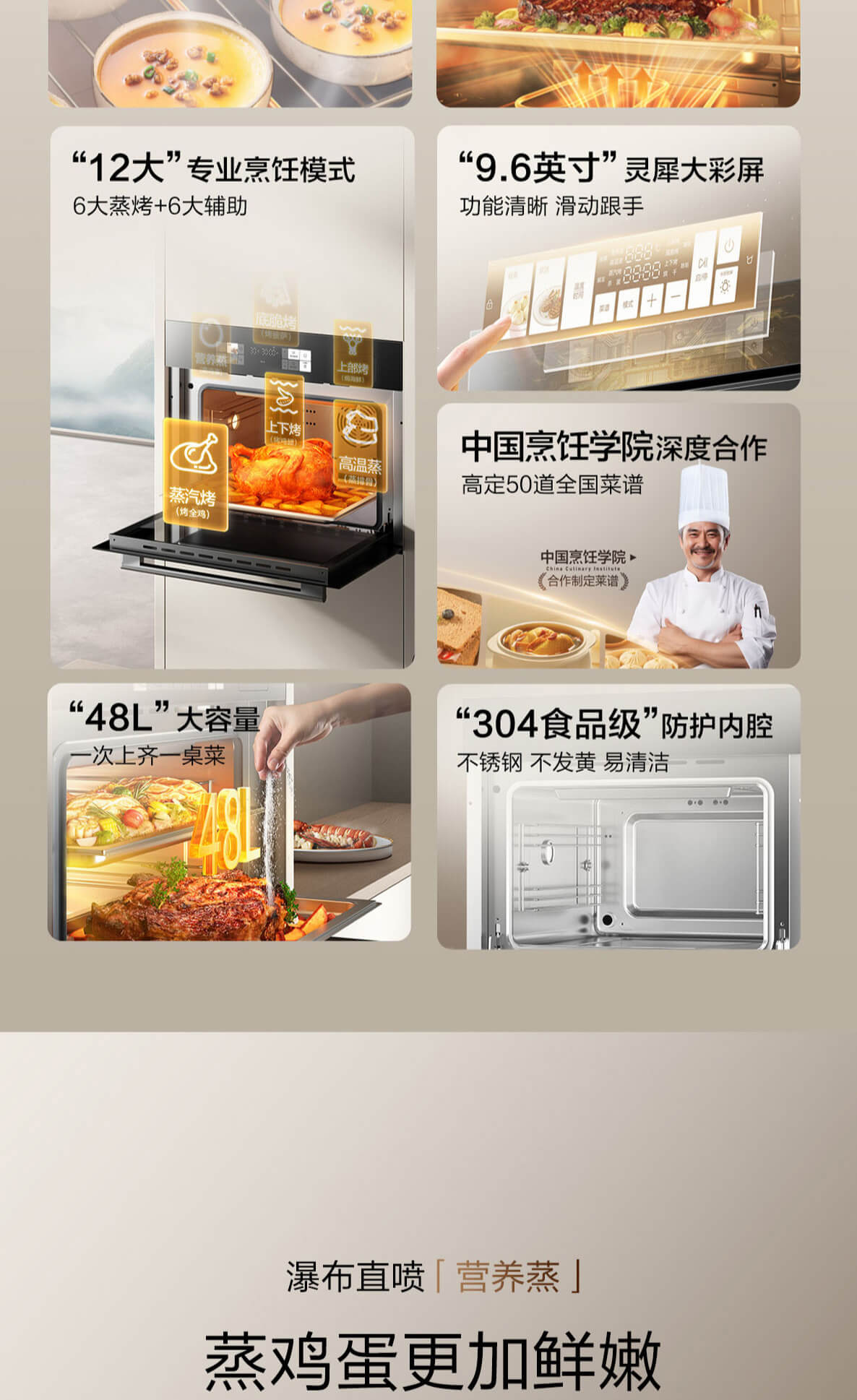 靈犀炫彩大屏,48L大容量,十二大專業蒸烤模式,上下雙管烤,直噴瀑布蒸汽,全304食品級不銹鋼,一鍵高溫殺菌